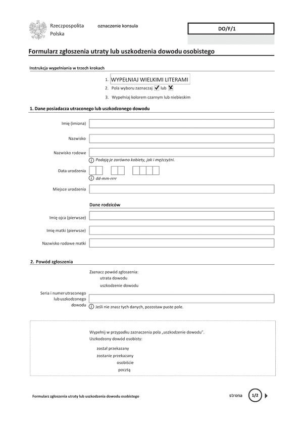 Utratę dowodu lub uszkodzenie należy zgłosić na formularzu utraty lub uszkodzenia dowodu osobistego: