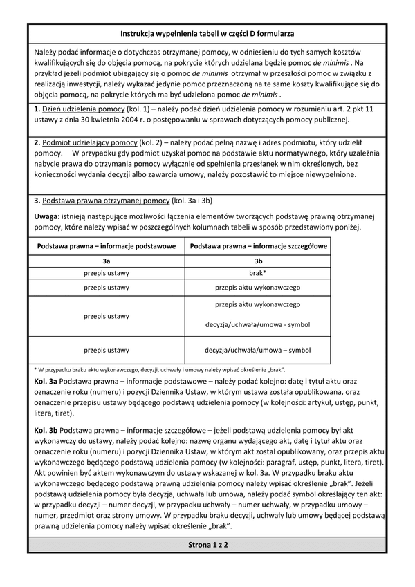 Objaśnienia do formularza informacji przedstawianych przy ubieganiu się o pomoc de minimis oraz instrukcja wypełniania części D znajduje się na stronie www.pfron.org.pl