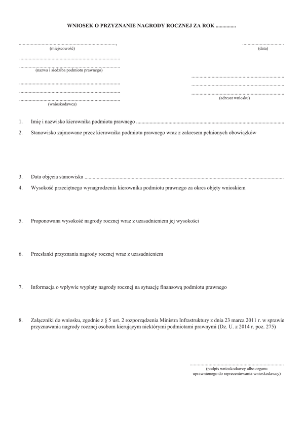 Obwieszczenie Ministra Transportu, Budownictwa i Gospodarki Morskiej z dnia 5 listopada 2013 r. w sprawie ogłoszenia jednolitego tekstu rozporządzenia Ministra Infrastruktury w sprawie przyznawania nagrody rocznej osobom kierującym niektórymi podmiotami prawnymi (Dz.U. 2014 poz. 275.
