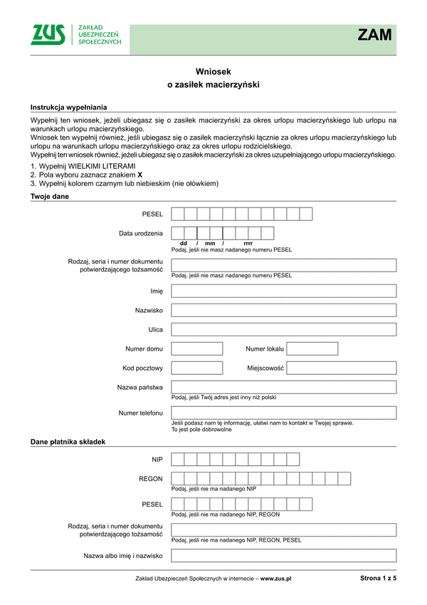 Wypełnij ten wniosek, jeżeli ubiegasz się o zasiłek macierzyński za okres urlopu macierzyńskiego lub urlopu na warunkach urlopu macierzyńskiego. Wniosek ten wypełnij również, jeśli ubiegasz się o zasiłek macierzyński łącznie za okres urlopu macierzyńskiego lub urlopu na warunkach urlopu macierzyńskiego oraz za okres urlopu rodzicielskiego.