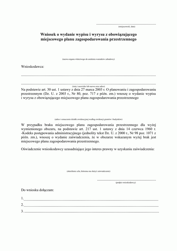 Przed złożeniem wniosku należy się upewnić, czy teren jest objęty ustaleniami obowiązującego planu miejscowego. Aby uzyskać wypis z miejscowego planu zagospodarowania przestrzennego należy złożyć wypełniony wniosek, który powinien zawierać: