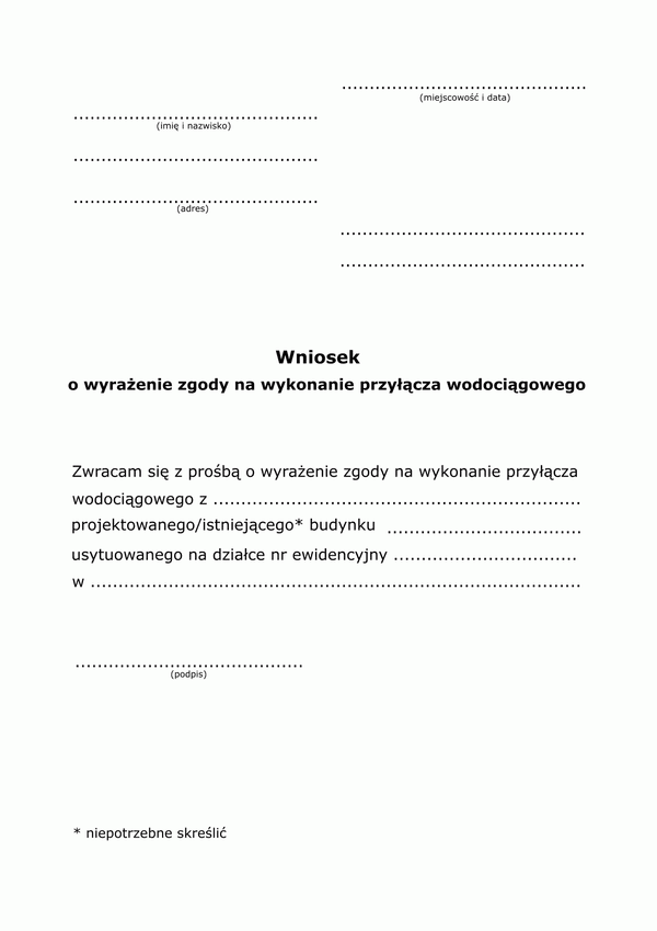 Do wniosku o wyrażenie zgody na wykonanie przyłącza wodociągowego należy dołączyć: