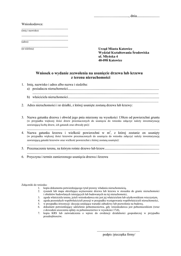 Zgodnie z art. 83 ust. 1 ustawy o ochronie przyrody usunięcie drzew lub krzewów z terenu nieruchomości może nastąpić po uzyskaniu zezwolenia wydanego przez wójta, burmistrza albo prezydenta miasta na wniosek posiadacza nieruchomości. Jeżeli posiadacz nieruchomości nie jest właścicielem lub użytkownikiem wieczystym, do wniosku dołącza się zgodę jej właściciela.