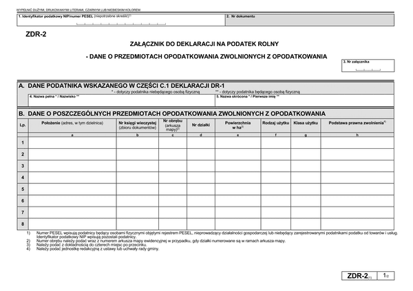 Formularz DR-1 przeznaczony dla osób prawnych, jednostek organizacyjnych oraz spółek nieposiadających osobowości prawnej będących właścicielami gruntów, posiadaczami samoistnymi gruntów, użytkownikami wieczystymi gruntów, posiadaczami gruntów stanowiących własność Skarbu Państwa lub jednostki samorządu terytorialnego oraz dla osób fizycznych będących współwłaścicielami lub współposiadaczami z osobami prawnymi lub z jednostkami organizacyjnymi, w tym spółkami, nieposiadającymi osobowości prawnej.