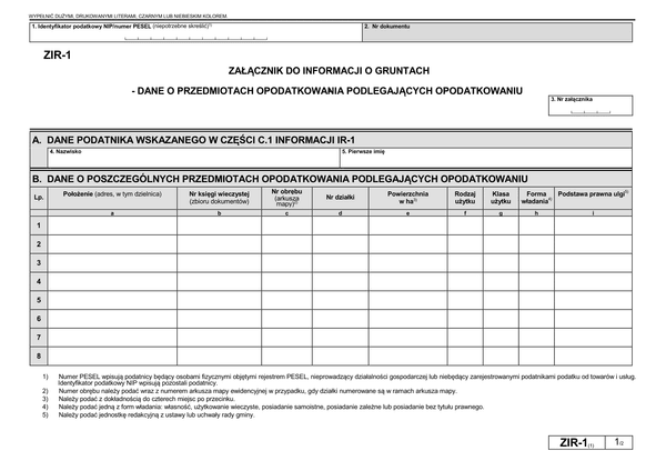 Formularz IR-1 przeznaczony jest dla osób fizycznych będących właścicielami gruntów, posiadaczami samoistnymi gruntów, użytkownikami wieczystymi gruntów, posiadaczami gruntów stanowiących własność Skarbu Państwa lub jednostki samorządu terytorialnego, a także będącymi posiadaczami gruntów na podstawie umowy zawartej stosownie do przepisów o ubezpieczeniu społecznym rolników lub przepisów dotyczących uzyskiwania rent strukturalnych.