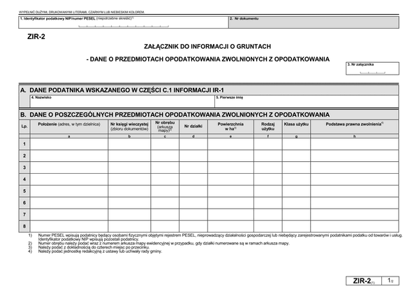 ZIR-2 (1) Załącznik do informacji o gruntach - dane o przedmiotach opodatkowania zwolnionych z opodatkowania