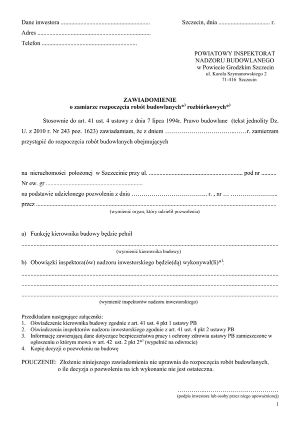 2. Inwestor jest obowiązany zawiadomić o zamierzonym terminie rozpoczęcia robót budowlanych, na które jest wymagane pozwolenie na budowę, właściwy organ nadzoru budowlanego (tj. Powiatowego Inspektora Nadzoru Budowlanego dla Miasta Szczecina, Pl. Armii Krajowej 1) oraz projektanta sprawującego nadzór nad zgodnością realizacji budowy z projektem, co najmniej na 7 dni przed ich rozpoczęciem, dołączając na piśmie: