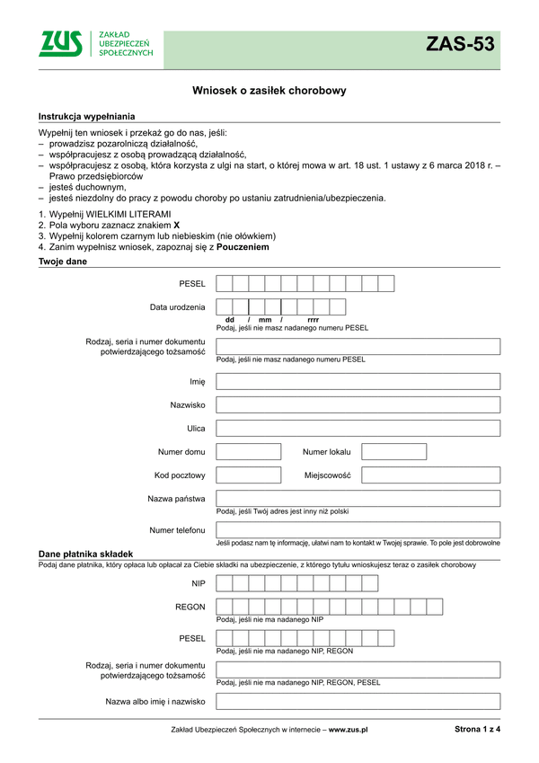 ZAS-53 jest wnioskiem składanym dla przyznania zasiłku chorobowego na podstawie otrzymanego w formie elektronicznej zwolnienia lekarskiego za dalszy okres nieprzerwanej zdolności do pracy lub również w przypadku zachorowania po ustaniu zatrudnienia/tytułu ubezpieczenia (na podstawie otrzymanego zwolnienia lekarskiego w formie elektronicznej e-ZLA).