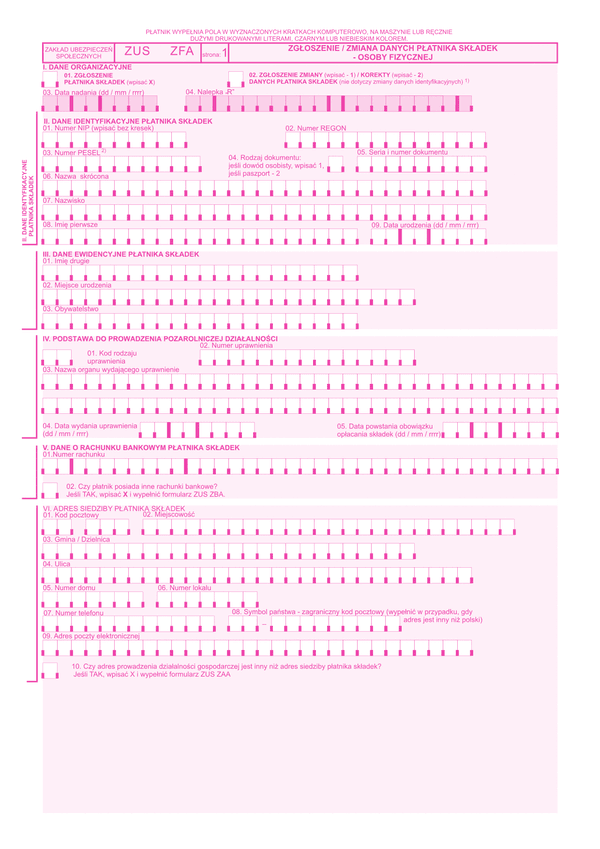 Formularz ZUS ZFA przeznaczony jest dla płatników składek będących osobami fi zycznymi.